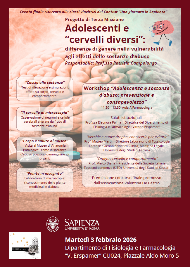 Il progetto "Adolescenti e Cervelli Diversi" mira a sensibilizzare i giovani sul tema delle sostanze d’abuso, con un focus sulle differenze di genere nella vulnerabilità agli effetti delle droghe. Attraverso lezioni interattive, laboratori didattici e contest creativi, gli studenti vengono coinvolti in un percorso educativo che combina scienza, prevenzione e consapevolezza. L’obiettivo è fornire loro strumenti pratici e conoscenze scientifiche per comprendere i rischi associati all’uso di sostanze psicoattive, favorendo scelte di vita più salutari.