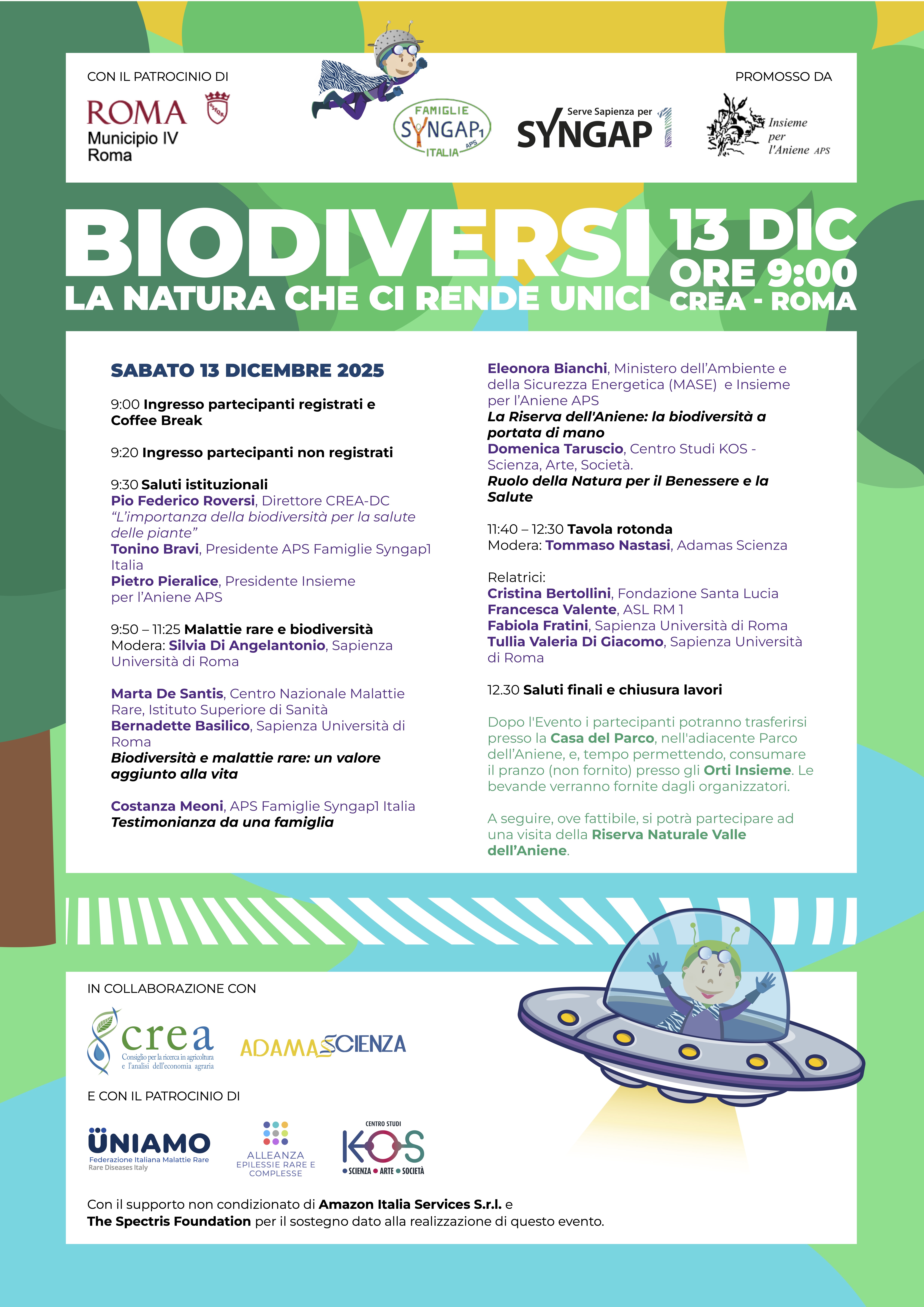 Il progetto Serve Sapienza per Syngap1 è lieto di segnalare l’evento BIODIVERSI – La natura che ci rende unici, una giornata di approfondimento dedicata al rapporto tra biodiversità, salute e malattie rare, con particolare attenzione ai temi della neurodiversità e delle patologie genetiche complesse. L’iniziativa, promossa da Famiglie Syngap1 Italia, Serve Sapienza per Syngap1 e Insieme per l’Aniene APS, si svolgerà il 13 dicembre 2025 presso il CREA di Roma, con il patrocinio del Municipio IV di Roma, di UNIAMO e dell’Alleanza Epilessie Rare e Complesse, e in collaborazione con CREA e Adamas Scienza.